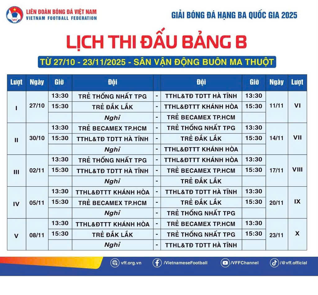 Ban Tổ chức Giải Bóng đá hạng Ba quốc gia năm 2025 xin trân trọng giới thiệu Lịch thi đấu Vòng loại, Bảng B tại Sân vận động Buôn Ma Thuột.